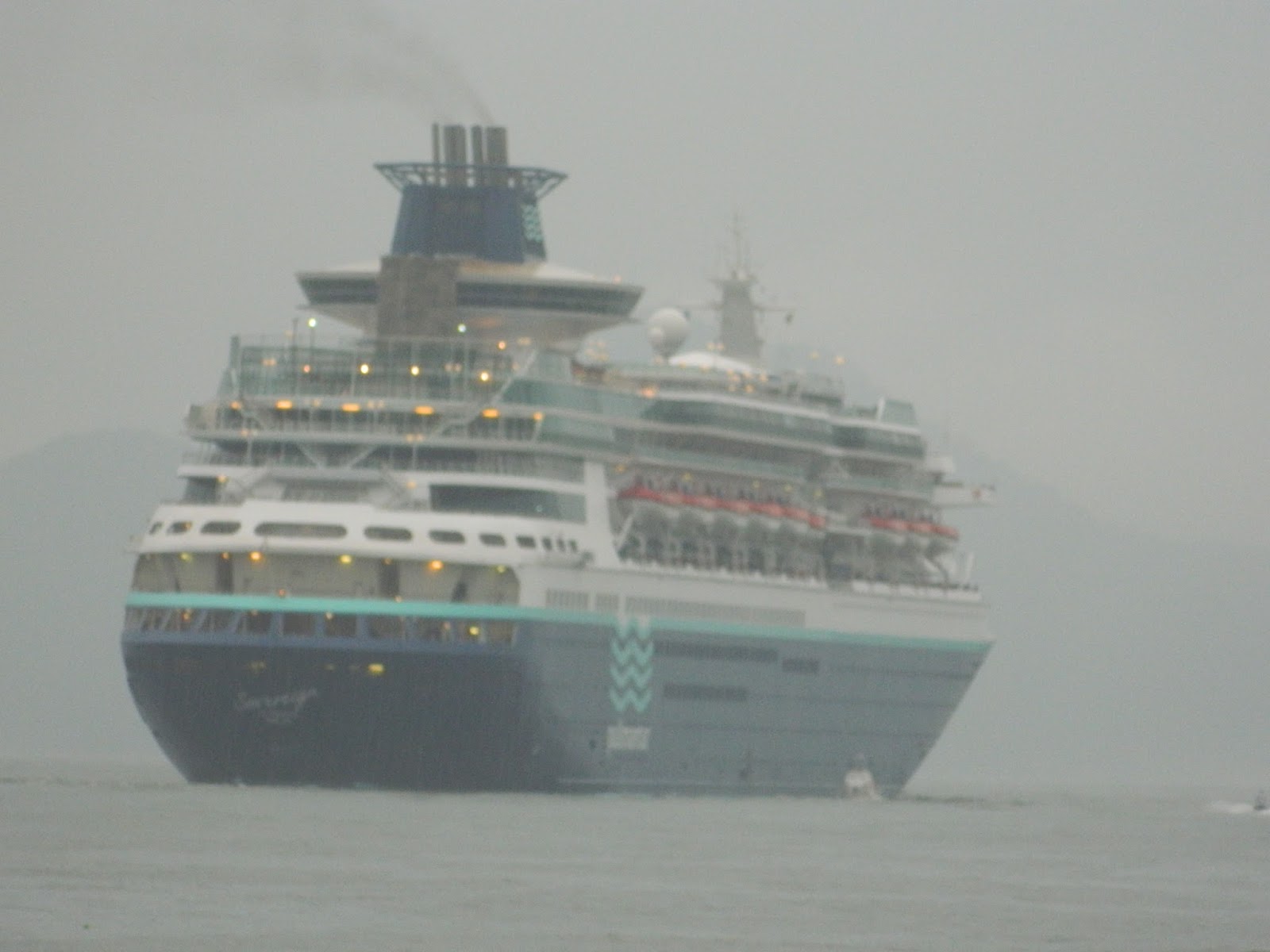 | Sovereign, ainda com cores antigas da Pullmantur, enfrenta tempo ruim ao deixar o porto de Santos. Condições climáticas desfavoráveis podem ter sido motivo do retorno ao porto carioca essa noite. |