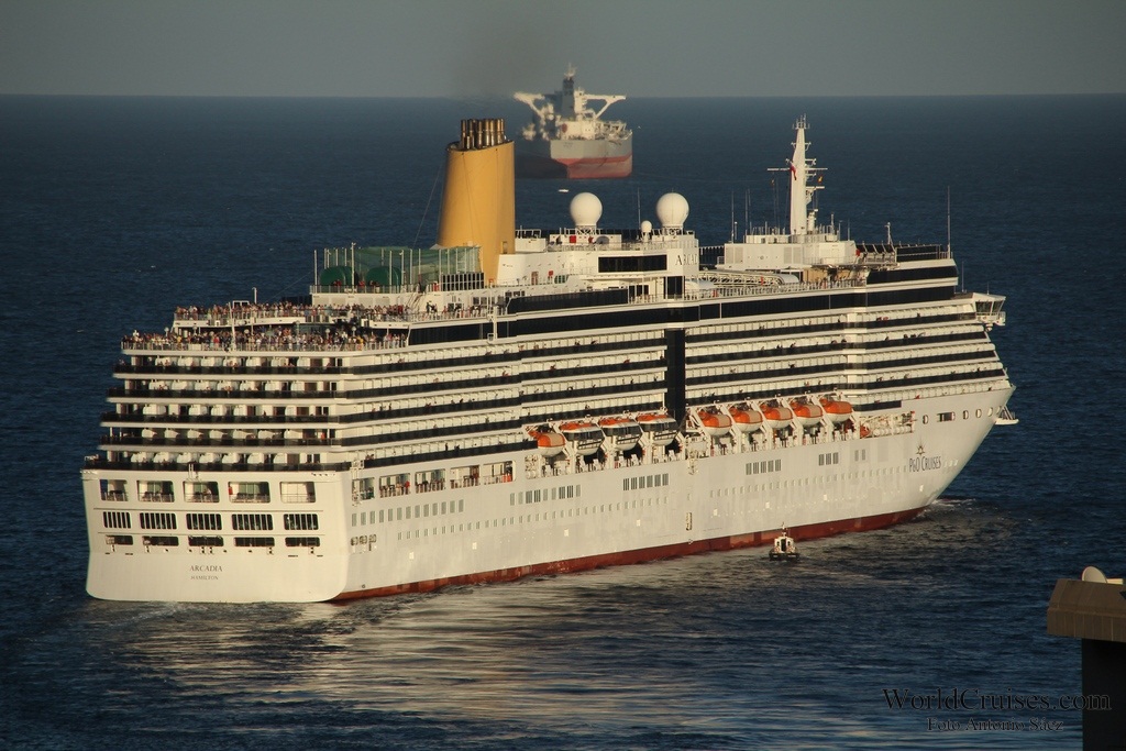 Construído em 2005, o Arcadia não é novo, e costuma realizar cruzeiros de volta ao mundo anual- mente, porém, suas viagens costumavam realizar mais escalas no Oriente, e por isso, até então não havia chego à América do Sul. O navio, que é exclusivo para passageiros adultos, foi encomendado em 2003 para a Cunard Line, outra companhia inglesa do grupo Carnival, mas acabou transferido para a P&O pouco depois enquanto ainda em construção. É o segundo navio na frota da companhia a ter este nome.