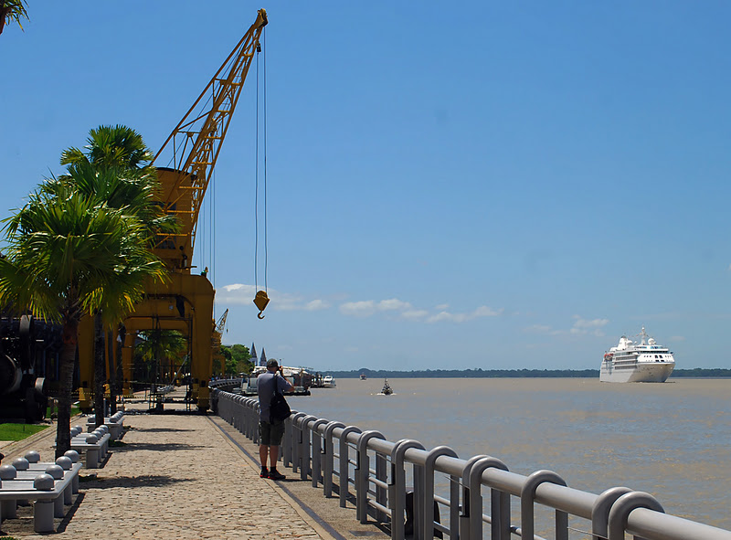 No dia 15 de novembro passado, Belém recebeu a segunda escala da atual temporada, o Silver Cloud, que proce- dente da Ilha do Diabo (Devil’s Island, na Guiana Francesa) lançou âncora em frente ao terminal de Miramar por volta das 07h no horário local. Ao contrário do Albatros, que abriu a temporada e ficou fundeado em Icoaraci, o Silver Cloud, por ser um navio de menores dimensões (156m) seguiu direto para a baia do Guajará, e devido ao grande número de navios aguardando em frente a cidade, ficou em uma posição incomum para este tipo de embarcação em nossa capital, dificultando a obtenção de registros fotográficos a partir de terra. Felizmente, com a maré cheia e sob um sol escaldante, ele movimentou-se para atracar diretamente no cais, o que aconteceu ao meio dia. O Silver Cloud, gêmeo do Silver Wind, é um navio com capacidade máxima de 315 passageiros e 185 tripulantes, tendo sido construido em 1994, na Itália. No cruzeiro atual, o Silver Cloud seguirá até Manaus, com diversas escalas, devendo escalar novamente Belém no dia 01 de dezembro. Nas fotos, vê-se a passagem do navio em frente a Estação das Docas, quando de sua chegada.
