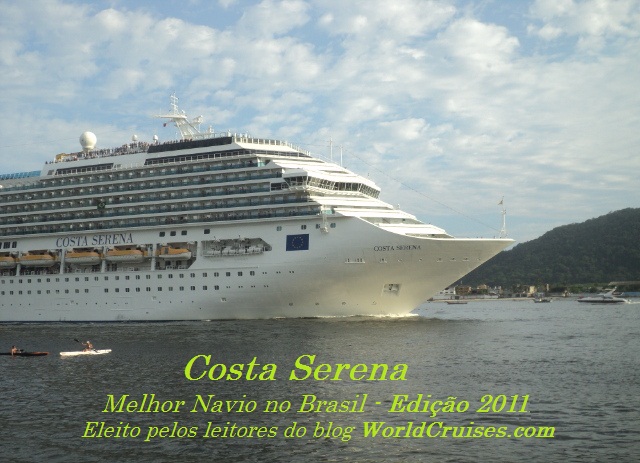 Com 290 votos o Costa Serena, da Costa Crociere foi eleito o melhor navio no Brasil na edição 2011 de nossa enquete anual. O “prêmio Melhor Navio no Brasil” começou em 2009, quando o Vision of the Seas foi o mais lembrado pelo público, e levou o título. No ano seguinte, 2010, o Costa Serena já havia sido o mais votado e esse ano, se sagrou “bicampeão”, com dois títulos seguidos. Na disputa entram somente navios que estiveram no país em 2011, misturando os da temporada 2010/2011 e 2011/2012 em um total de 21 navios. A disputa esse ano, porém, foi mais equilibrada do que a do último ano, quando o Serena ganhou com mais de 50% dos votos. Desta vez, o navio ficou com 25% dos votos, ou 290 votos, seguido pelo MSC Orchestra com 125 votos ou 10% da preferência e pelo Splendour of the Seas que recebeu 115 votos, ou 9% do total. Confira os dez primeiros colocados: