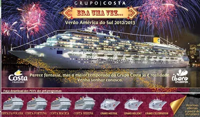 Surpreendendo a todos, a Costa Crociere, anunciou agora a pouco, a sua mais nova temporada na América do Sul, a 2012/2013. O anúncio dos novos roteiros não era esperado, por isso, pode ser considerado surpreendente. Porém, na prática, há poucas novidades. Sob sua própria marca, a companhia italiana terá quatro navios: Costa Favolosa, a novidade, entregue esse ano, o Costa Serena, que ficará baseado exclusivamente em Buenos Aires, e os já viajados Costa Magica e Costa Fortuna. A marca espanhola do grupo, a Ibero Cruceros, terá novamente o seu trio: Grand Mistral, Grand Celebration e Grand Holiday. Já a AIDA, assim como na atual temporada, trará dois navios que terão embarques no Brasil destinados aos passageiros alemães. A temporada já tinha sido prevista por nós em Agosto, portanto, nossos leitores já estavam a par da situação da companhia, para ver nossa previsão, clique aqui.