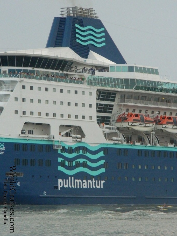 Escalou no último Sábado em Santos o Empress, ex-Empress of the Seas e Nordic Empress, hoje na Pullmantur, com as novas cores de sua companhia. Como adiantado por nós em 15 de Novembro, a Pullmantur está atualizando seu logo, e as cores de toda sua frota, de navios, aviões e ônibus, em comemoração aos 10 anos de sua operação independente. A informação foi confirmada recentemente pela empresa. Por enquanto, o Sovereign e o Empress possuem os tons de azul em seu casco e chaminé, enquanto o Zenith, ainda opera com o antigo logo Ñ, e chaminé vermelha. Explica-se: os dois primeiros tinham previsto um período em doca-seca antes da temporada brasileira, enquanto o Zenith, tem esse período em manutenção agendado para depois da temporada no Brasil. Assim, deverá receber a nova pintura somente para a temporada européia.