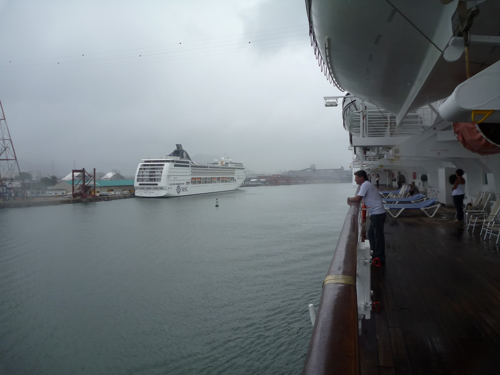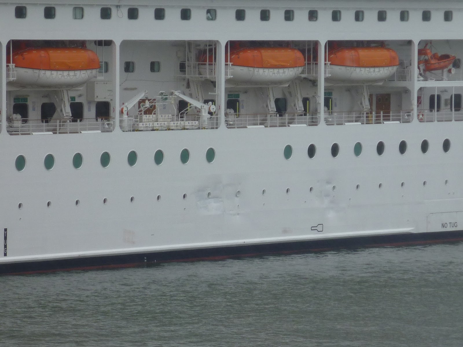 Fotos do MSC Opera atracado em Santos em sua mais recente escala. Na segunda, é visível a parte do navio que teria sofrido dano, após choque com o cais em Buenos Aires. As fotos foram gentil- mente enviadas por Diogo Kyrillos, tripulante do Bleu de France, a quem agradecemos.
