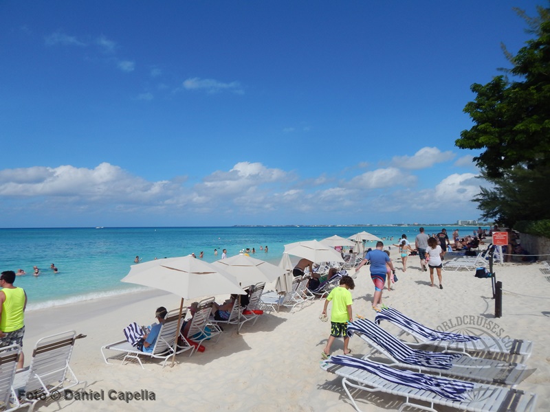 Navios ao fundo, e a praia de Seven Mile