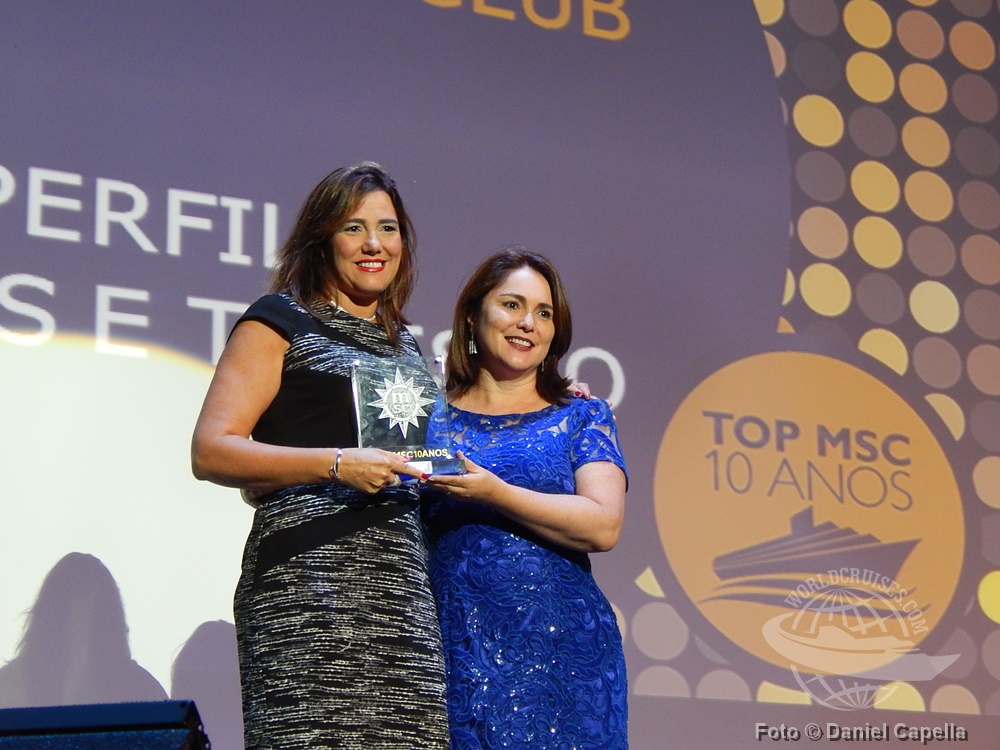 | Márcia Leite, diretora de operações da MSC entrega um dos prêmios para a Perfil Viagens e Turismo. |