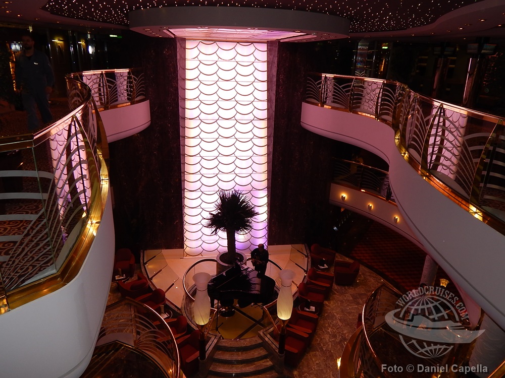 | Um dos principais e mais emblemáticos espaços a bordo é o átrio Gocce, com seus três andares. |