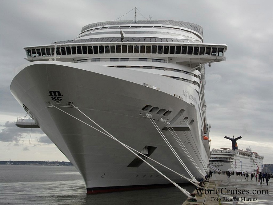 Na cidade portuguesa, o navio da classe Fantasia foi apre- sentado a imprensa portuguesa, e recebeu Rui Agostinho e Ricardo Martins, correspon- dentes do blog WorldCruises.com, que nos enviaram várias fotos dos interiores do Preziosa, e que publicamos na postagem seguinte. Com capacidade para cerca de 4,000 passageiros, a embarcação é a última encomendada pela MSC, que com sua entrega, passa a não ter nenhum navio em construção ou sendo projetado, algo extraordinário na história da companhia.