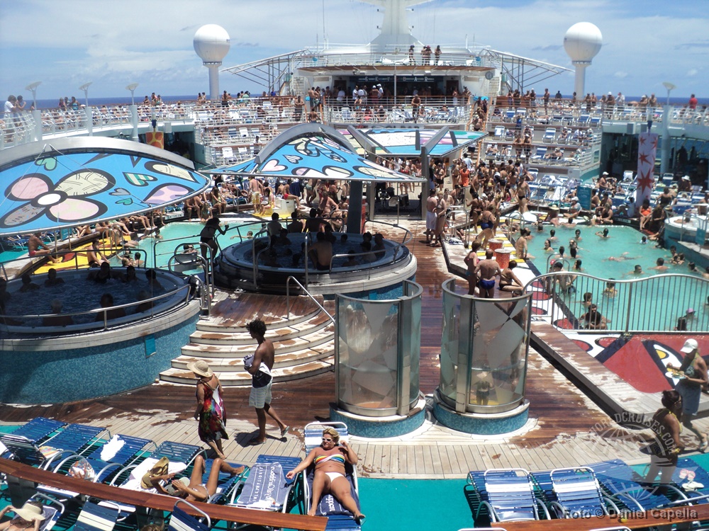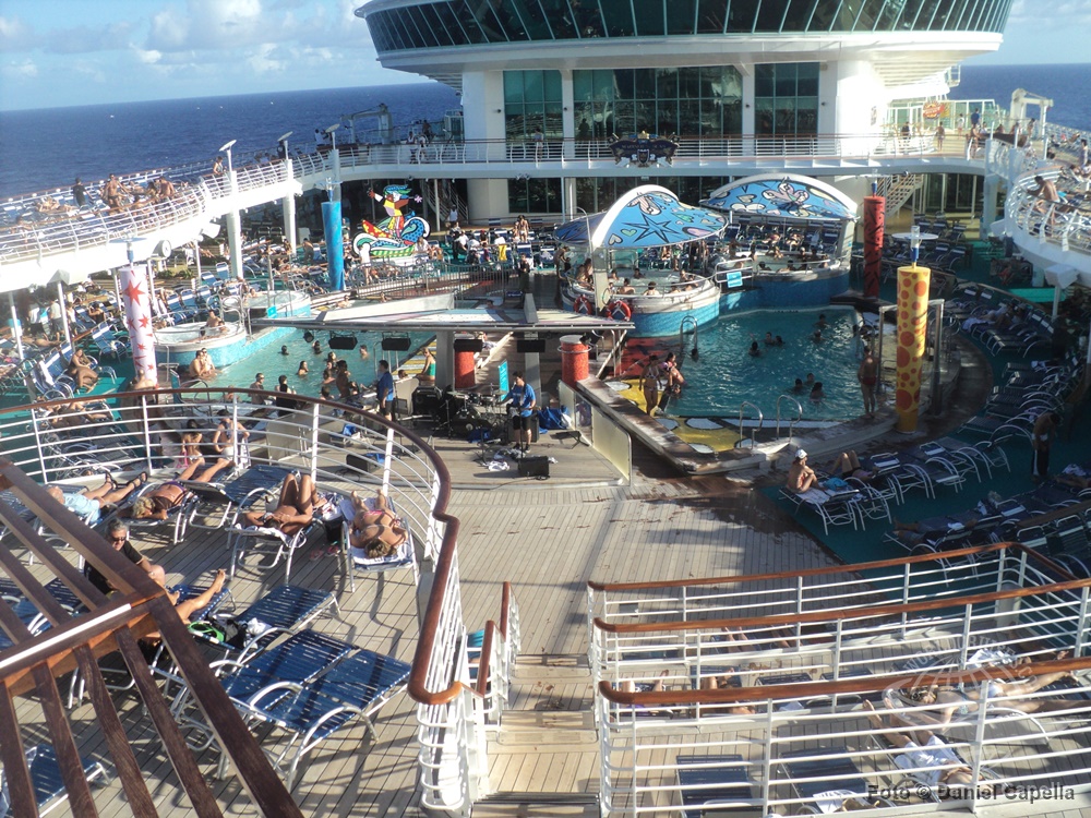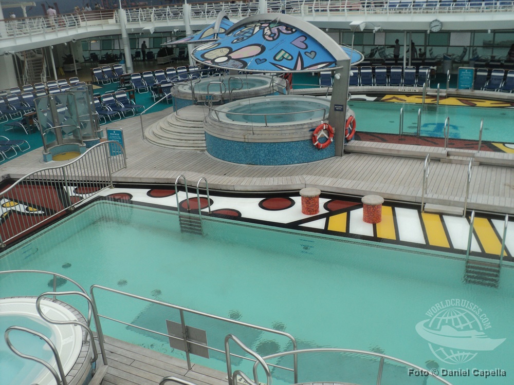 A área principal de piscinas durante um dia de navegação, na primeira e única temporada brasileira do navio. |