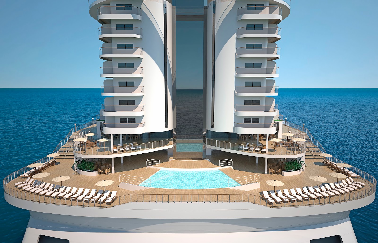 Popa do novo MSC Seaside; o navio foi projetado de forma a unir o passageiro