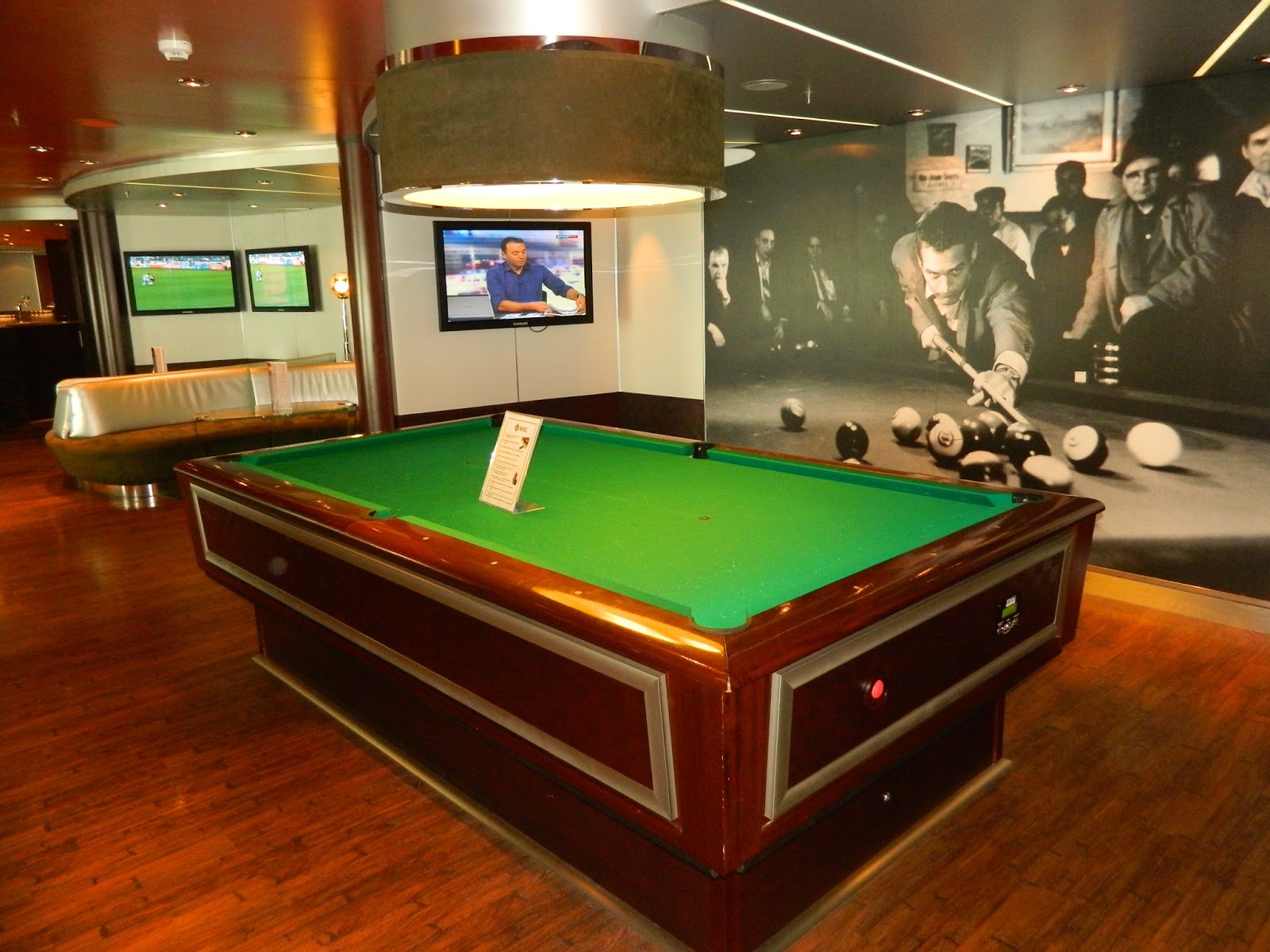 O espaço conta com uma mesa de bilhar que se nivela automaticamente, e pode ser utilizada mesmo em mares revoltos. |