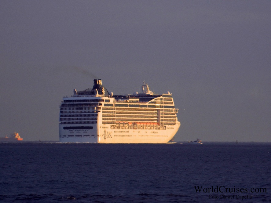 | Enquanto o Magnifica deixava um porto de um lado, do outro, o pôr-do-sol iluminava com tons dourados o Emissário Submarino. |