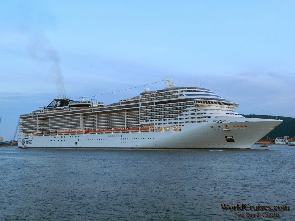 O MSC Preziosa, maior navio da temporada, continua realizando seus embarques na América do Sul. No último dia 3 partiu de Santos para um novo mini-cruzeiro de 3 noites.