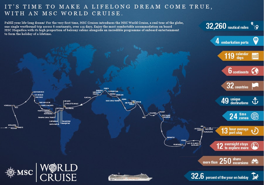 A viagem de volta ao mundo da MSC acontecerá a bordo do MSC Magnifica, mais novo navio da classe Musica. O Magnifica partirá de Gênova no dia 5 de janeiro de 2019 e encerrará a sua viagem de volta ao mundo atracando neste mesmo porto após 119 dias, e passagens por seis continentes, e 49 destinos em 32 países,