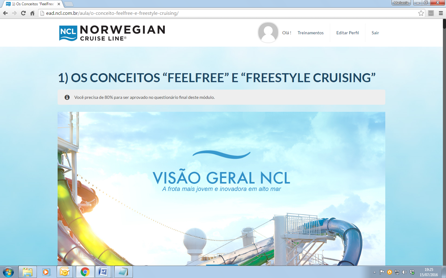 A Norwegian Cruise Line (NCL) lançou um curso de capacitação á distância para agentes de viagem brasileiros. Disponível em um site desenvolvido especialmente para essa função, o curso vale um certificado para o profissional que tiver bom desenvolvimento.