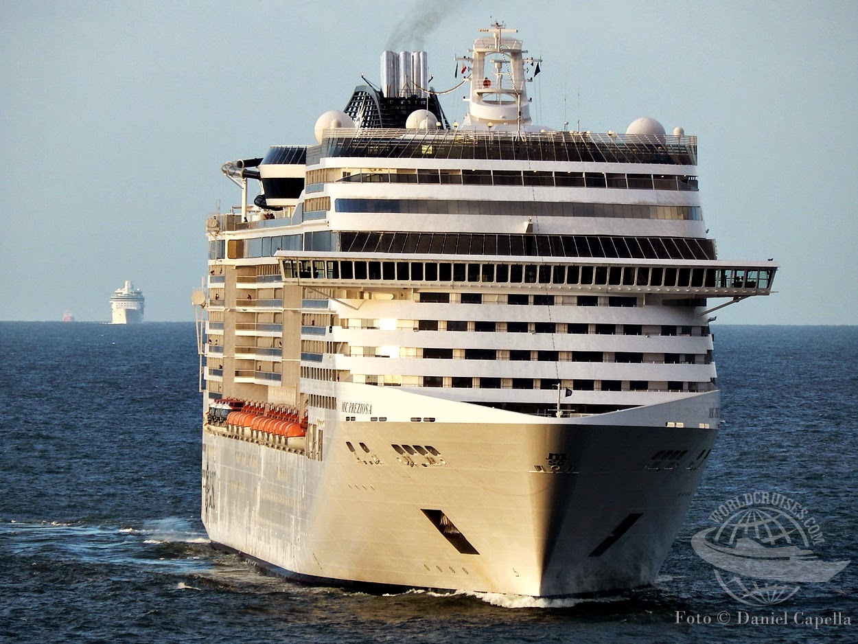 Acompanhando de perto o navio da Costa desde a barra de Santos, o MSC Preziosa foi o terceiro navio a entrar no porto. Maior navio da temporada brasileira, o flagship da MSC Crociere atracou no cais do armazém 31, encerrando o temático Energia na Véia de 2015. Temático, o cruzeiro atingiu nesse ano sua nona edição, e celebra as décadas de 70 e 80, com música da época e atividades nostálgicas. Após embarcar novos passageiros, partiu no começo da noite para um de seus últimos mini-cruzeiros da temporada. Com 4 noites, a viagem escala Búzios e Ilha Grande, balneários no litoral do Rio de Janeiro.