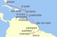 O primeiro destino brasileiro pelo qual o navio passará é Santarém, no dia 2 de junho. Em seguida, escala o vilarejo de Boca da Valéria, a capital amazonense Manaus e a cidade de Parintins, respectivamente nos dias 3, 4 e 6. Antes de deixar o Rio Amazonas, ainda passa mais uma vez por Santarém, no dia 7.
