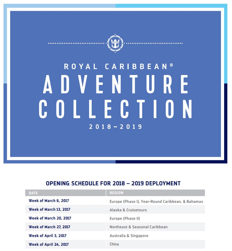 Em abril, a Royal Caribbean divulgará seus roteiros a partir da Austrália e de Singapura, e por último os roteiros a partir da China. Na tabela ao lado, estão disponíveis as datas exatas.