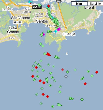 Ontem o porto de Santos bateu novo recorde em movimento de navios, desde ontem cerca de 90 navios esperavam por uma vaga para embarcar algum tipo de produto, ou estavam atracados. Desses, pouco mais de um terço espera para embarcar açúcar. Na foto, extraída do site MarineTraffic.com é possível ver 92 entre os atracados e os que estão à espera de uma vaga. O tempo médio de espera para realizar uma operação é de 25 dias.