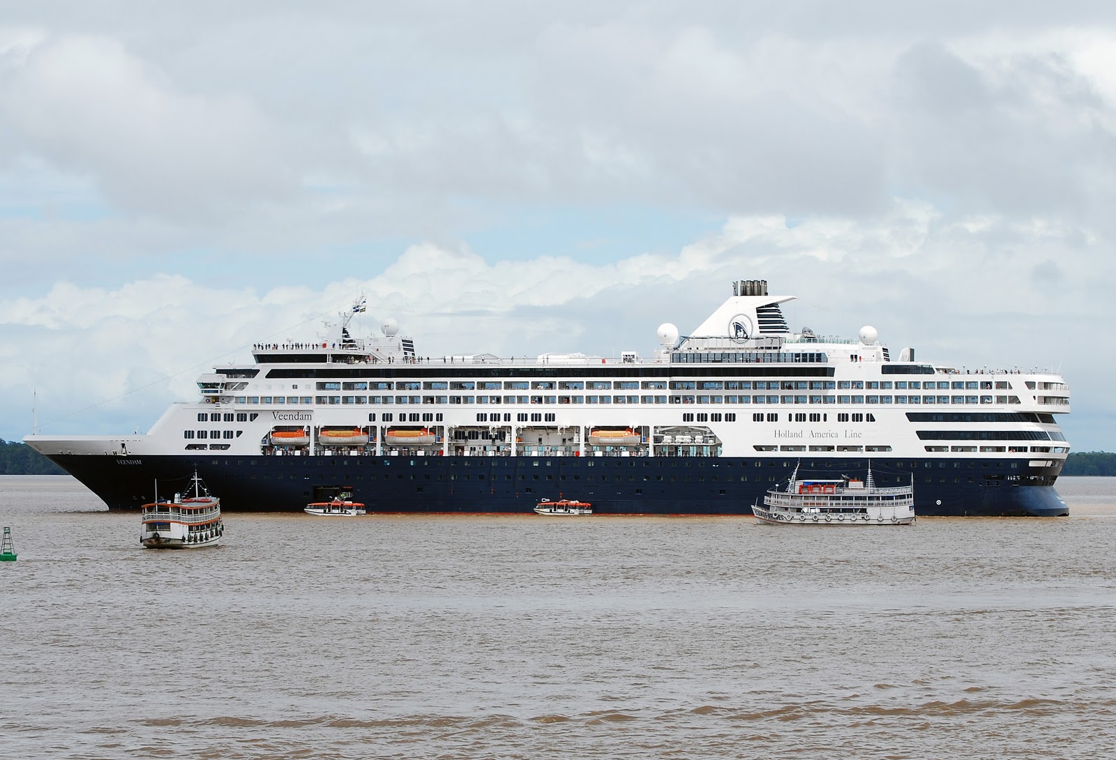 O Um barco regional, construido em madeira, se aproxima do Veendam para receber os passageiros e transporta-los até Icoaraci, enquanto alguns passageiros observam a partir do deck superior.