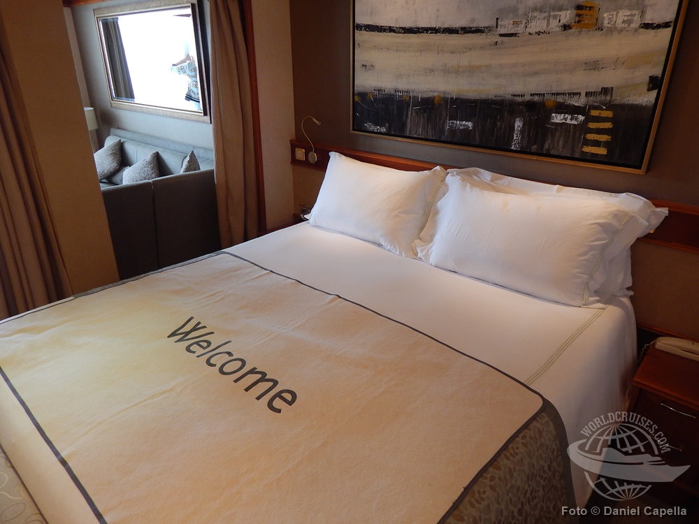 Cama de uma das suítes do navio, que só possui cabines com varanda |