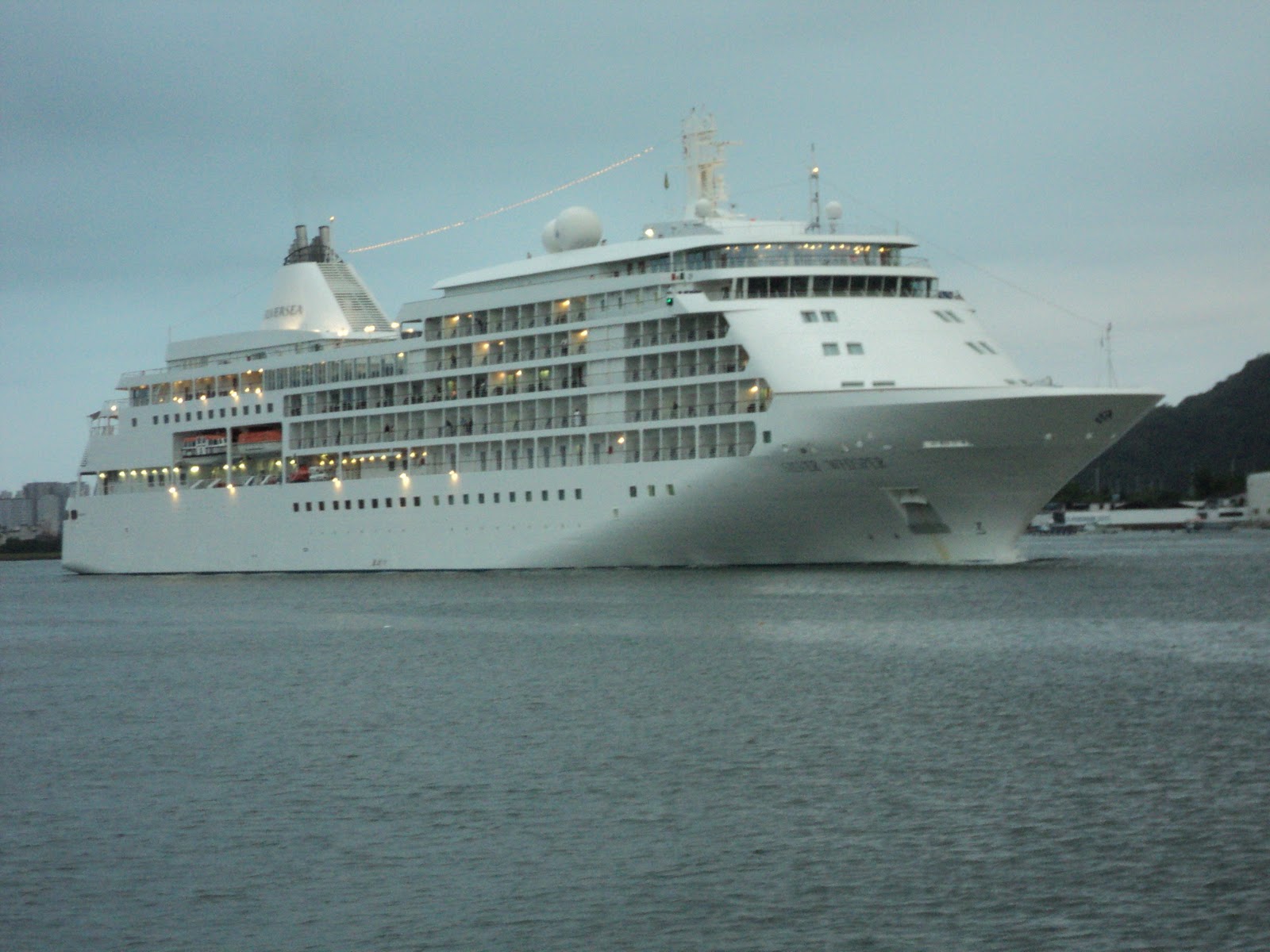 Ontem, escalou Santos o Silver Whisper, da SilverSea. Apesar de ser a primeira escala em muitos anos, esta não é a estréia dele na cidade. Praticamente toda a frota da SilverSea já fez escala em Santos (exceto o novo Silver Spirit), o Silver Whisper, as fez pela primeira vez na temporada 2001/2001, e desde então não voltou nem a Santos, nem ao Brasil. Esta escala foi também a primeira em trânsito da temporada. Apesar da chegada prevista para às 6 horas, o navio chegou às 7:45 horas, por motivos desconhecidos. Ele atracou no cais do Armazém 25, com 274 passageiros em trânsito, que iniciaram a viagem ontem no Rio de Janeiro. Esta viagem de 9 noites, iniciada ontem, faz parte de uma viagem maior, de 59 noites, que começou em 4 de Outubro, em Nova York, e termina no dia 3 de Dezembro, em Valparaíso. A saída do navio estava prevista para as 18 horas, mas aconteceu somente por volta das 19 horas. Nas fotos ele é visto ao passar pela Ponta da Praia, exatamente às 19:14 horas. Ele seguiu para Rio Grande, no Rio Grande do Sul, apesar de, a princípio, estar prevista amanhã uma escala em Itajaí. O Silver Whisper tem 28 mil toneladas, e capacidade para até 396 passageiros.