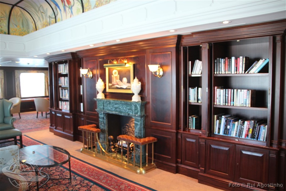 A área é inspirada nas bibliotecas clássicas inglesas, e serve também como um dos principais centros de convivência do navio, com não apenas livros, mas também jogos e gincanas. |