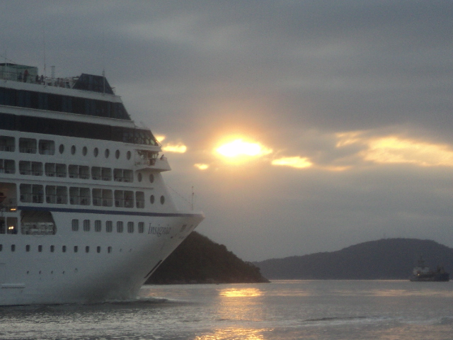 O Insignia voltou a Santos para mais algumas escalas em trânsito, o que faz todas as temporadas desde 2004. Porém, desta vez, foram várias escalas. Uma delas, a da foto acima, foi transferida para o dia de Natal. Isto, porque no dia 26, data inicialmente prevista para a escala, haviam 6 navios em Santos, e o Insignia seria o sétimo. Portanto, para fugir do movimento excessivo, o navio mudou a escala.