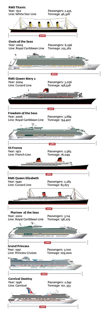 | Comparativo de vários navios atuais e de outras épocas com o Titanic (clique para ampliar). Foto de The Luxury Cruise Company. |