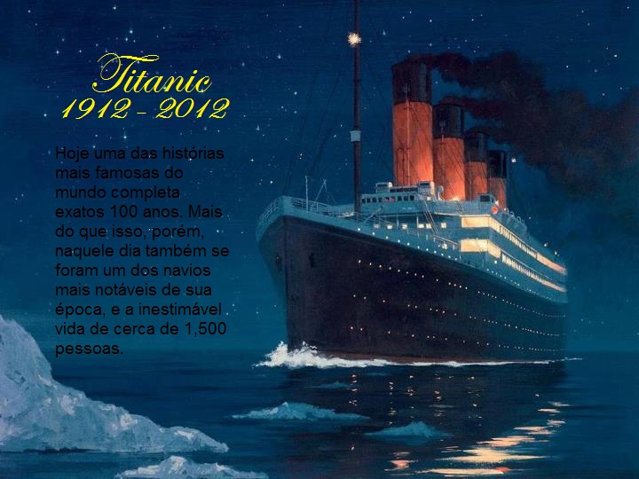 Às 23h30min do dia 14 de Abril de 1912, o Titanic, navio da White Star Line, se chocava contra um Iceberg nas gélidas águas do Atlân- tico Norte. Além do navio, perderam-se, aproxima- damente duas horas e meia depois, mais de 1,500 vidas, e muito da imagem da White Star.