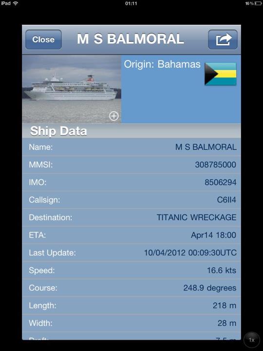 | Aplicativo de AIS mostra destino do Balmoral: Titanic Wreckage (Naufrágio do Titanic) |