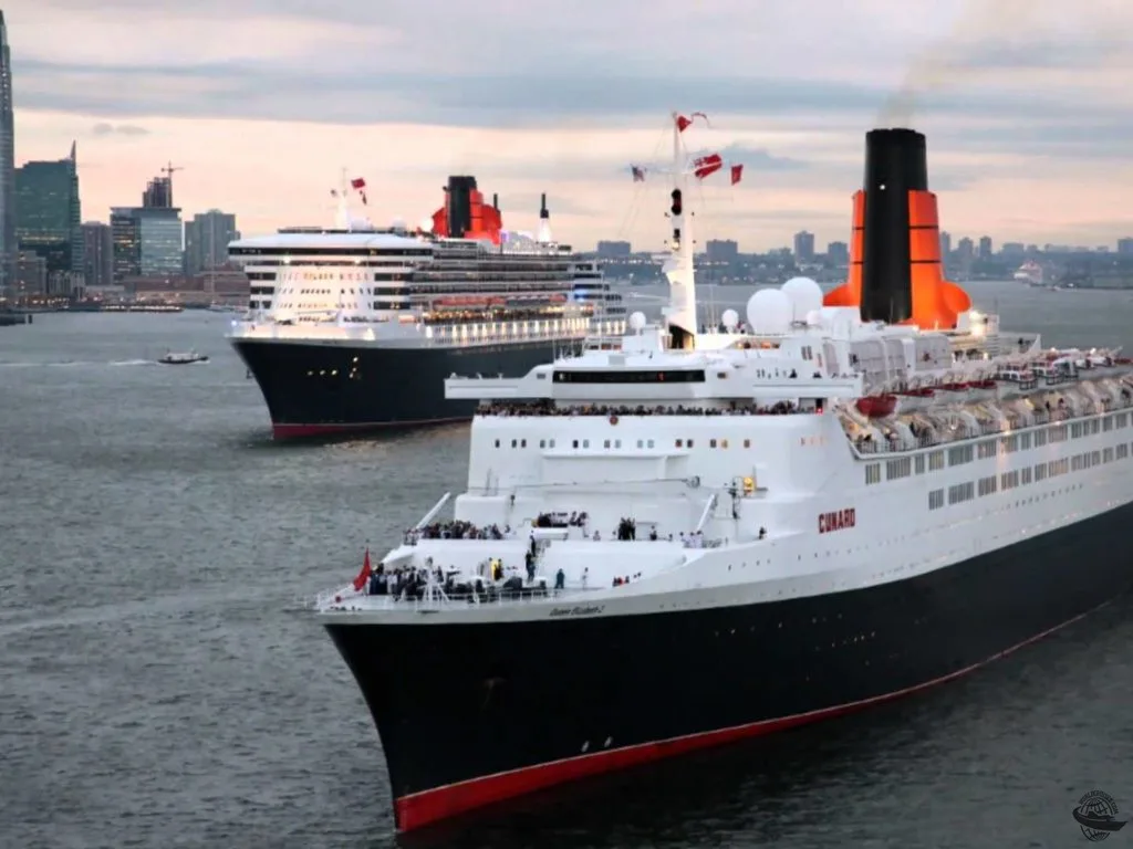 Queen Mary 2 (ao fundo) com seu antecessor, Queen Elizabeth 2
