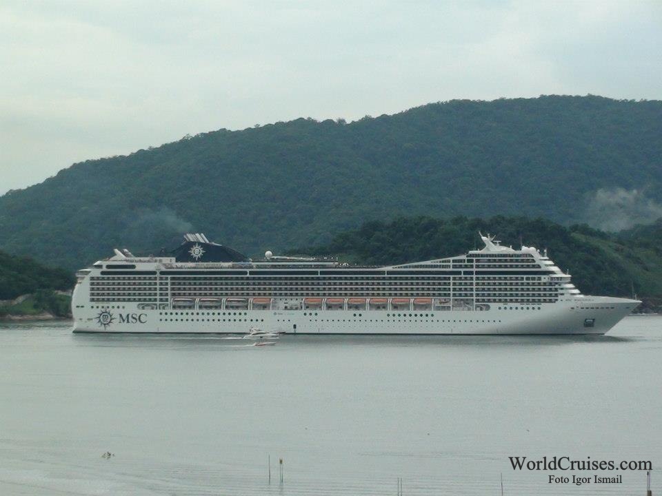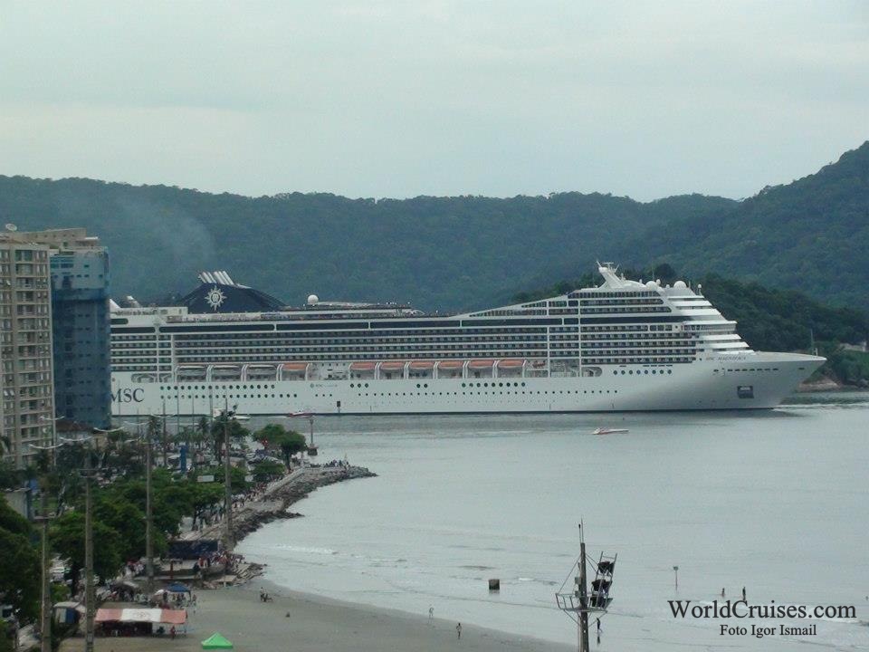 Logo em seguida passou pela Ponta da Praia o MSC Magnifica, da MSC Crociere. Um dos primeiros a chegar na cidade para a temporada, o navio está no país desde Novembro. Em sua primeira escala, no dia 13, estivemos, inclusive, a bordo e registramos vários de seus interiores. Neste domingo, deu início a um cruzeiro de sete noites, que só faz escalas fora do país, visitando Punta del Este e Montevideo, no Uruguai. além de Buenos Aires, na Argentina. Ao contrário do Fascinosa, e também do Empress, o Magnifica tem embarque exclusivo em Santos, e ao final da temporada, terá sido um dos navios a fazer mais escalas na cidade.