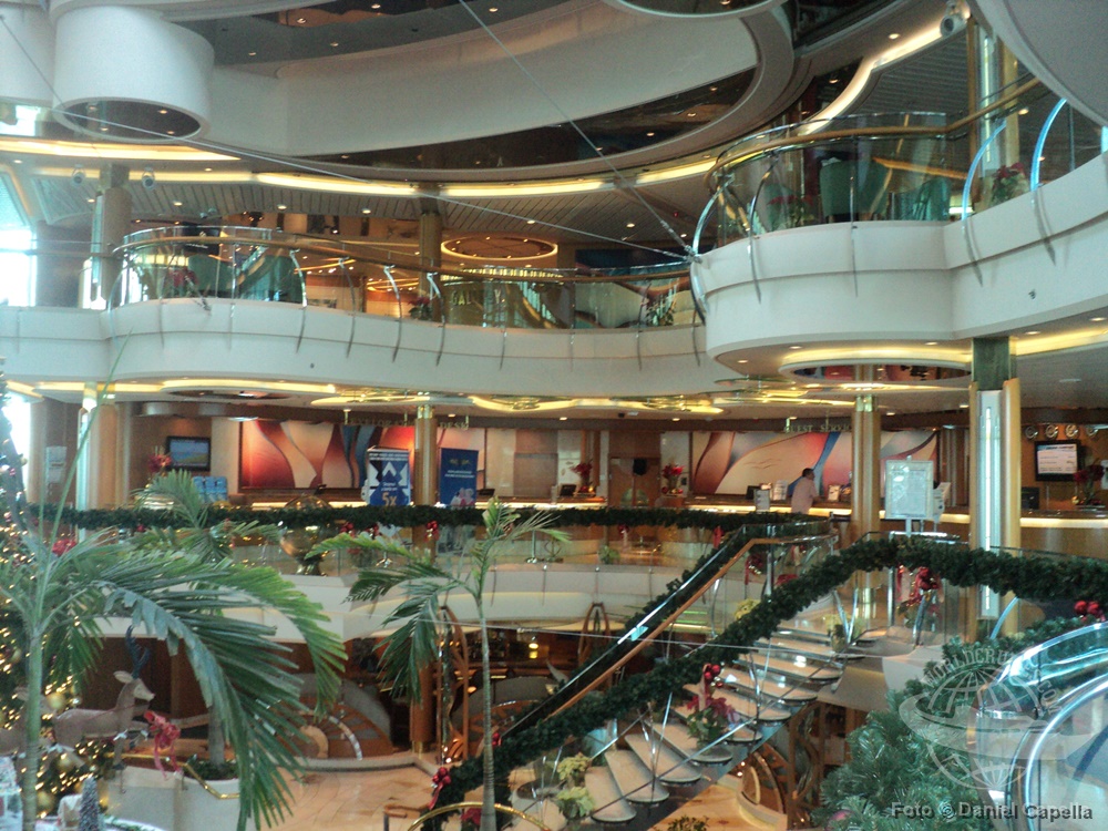 O Atrium Centrum é a principal área de convivência do navio, com seus vários andares de altura e decks avarandados. |